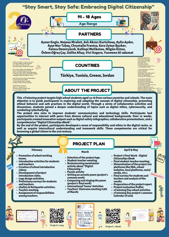 Bu eTwinning projesi, çeşitli ülkelerden ve okullardan14-18 yaş arası lise öğrencilerini hedeflemektedir.Temel amaç,katılımcılara dijital vatandaşlık kavramını keşfetme ve benimseme,dijitaldünya da etik davranışı ve güvenli uygulamaları teşvik etme konusunda rehberlik etmektir.Birdiziişbirlikçietkinlikvetartışmasayesindeöğrencilerdijitaletik,sibergüvenlikvesiberzorbalıklamücadelegibikonulardadahaderinbiranlayışkazandılar.Projeaynızamandaöğrencileriniletişimveteknolojibecerilerinigeliştirmeyidehedefliyor.Katılımcılar,farklıkültürelveeğitimselgeçmişleresahipakranlarıylaetkileşimkurmafırsatlarıbuldular.1haftaboyuncakatılımcılar,dijitalgüvenlikinfografikleri,işbirlikçisunumlarvekapsamlıbir"DijitalVatandaşlıke-Kitabı"gibiyenilikçiçıktılaroluşturdular.Projeninsonundakatılımcılar,dijitalalandasorumlulukveetikduygusugeliştirmeninyanısırakültürlerarasıanlayışveekipçalışmasıbecerilerikazandılar.Buyetkinlikler,1.yüzyıldaküreselbirvatandaşolmakiçinkritikönemesahiptir.